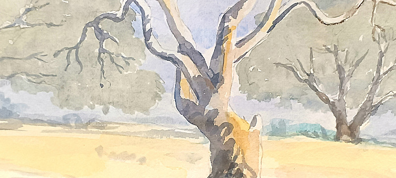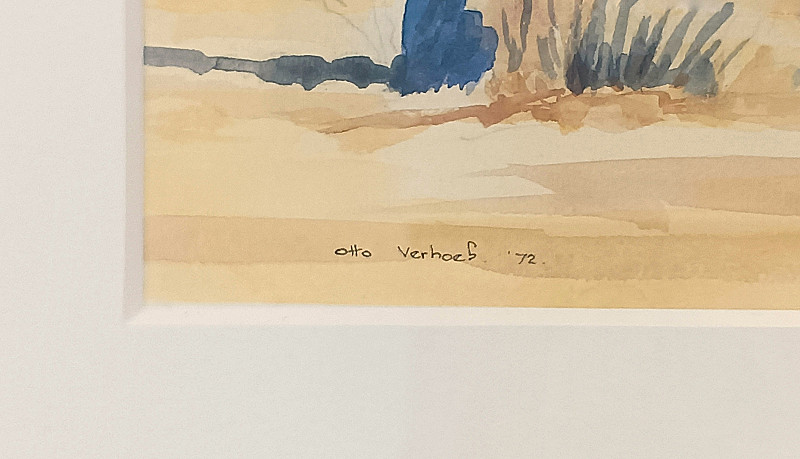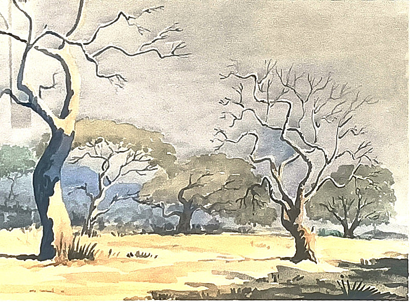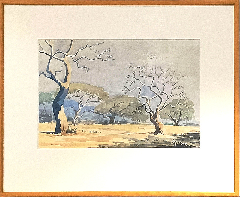 Bushveld Trees by Otto Verhoef from 1972 is a landscape painting that captures South Africa's bushveld. The artwork features a serene composition dominated by sprawling trees, native to the bushveld region, rendered in earthy tones. The painting emphasises the quiet strength of nature, typical of Verhoef's detailed landscape approach, blending watercolours with an expressive sense of place. The work evokes both the harshness and the natural beauty of South Africa's wilderness.