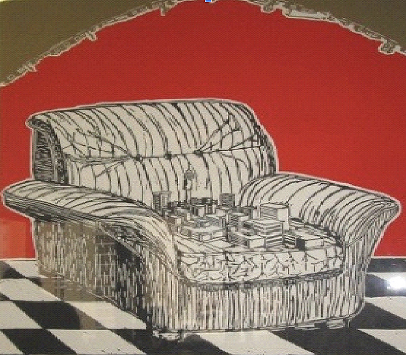The artwork depicts a large, striped armchair in a black-and-white checkered space, positioned against a bold red background. The chair's surface holds stacks of books, creating a sense of comfort and intellectual reflection. The vibrant red contrasts with the monochrome elements, emphasising the chair as a central figure, possibly symbolising relaxation or contemplation. The overall style combines graphic elements with a bold colour palette to draw attention to the scene.