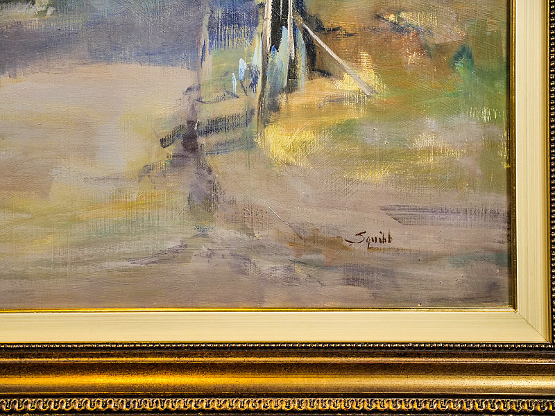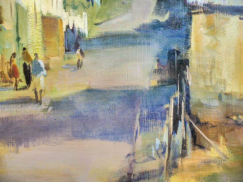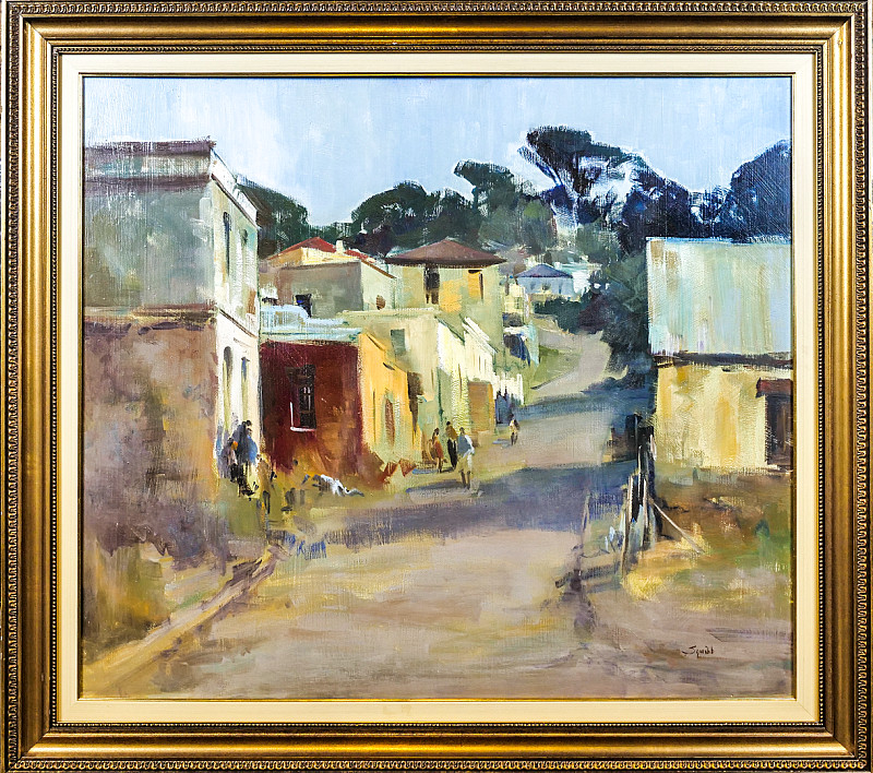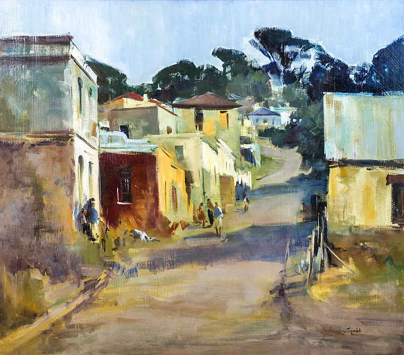 Abstract homes with people on the road? trees in the background, about 11 people spotted