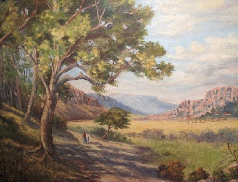 Dust Road in Landscape depicts a dusty, winding road cutting through a sun-drenched landscape, likely inspired by the country's arid regions. Botha's characteristic attention to detail is evident in the textured brushstrokes that bring the dry earth and scattered vegetation to life. The wide-open sky and distant horizon create a sense of vastness and solitude, while the muted tones of the land evoke the harsh yet serene atmosphere of the South African countryside.