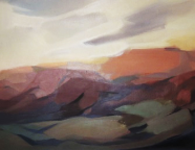 Klopcanovs uses soft, abstract brushstrokes to depict the rolling hills and plains of the Orange Free State region in South Africa. The colors transition from warm reds and oranges in the foreground to softer purples and blues in the background, evoking a sense of calm as the day fades. The sky is lightly clouded, with the fading light casting subtle shadows on the landscape, giving the scene a tranquil and almost dreamlike quality. The overall mood is peaceful, capturing the quiet beauty of the South African countryside.