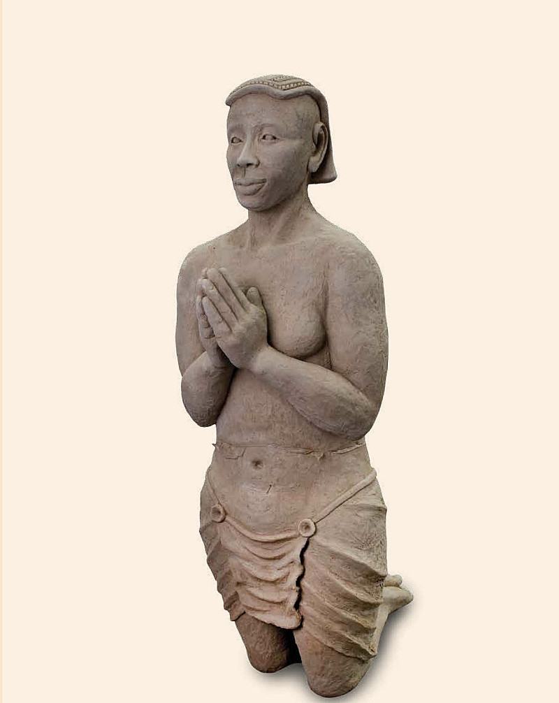‘She is Greeting’ (2015) embodies Helen Sebidi’s own channeling of her ancestors, a critical component of her artistic practice, who both inspire and guide her as she works. The female figure kneels as if in prayer, greeting spirits beyond our physical world and inviting them into her presence. The striking aesthetic parallels between Sebidi’s sculpture and the Luba Sanza are evident, the waist-like shape of the Sanza echoes the feminine silhouette of Sebidi’s figure, the folds of her skirt rippling down like the fanned tines of the instrument. They share the sacred role of welcoming and honouring the ancestors into the physical realm.