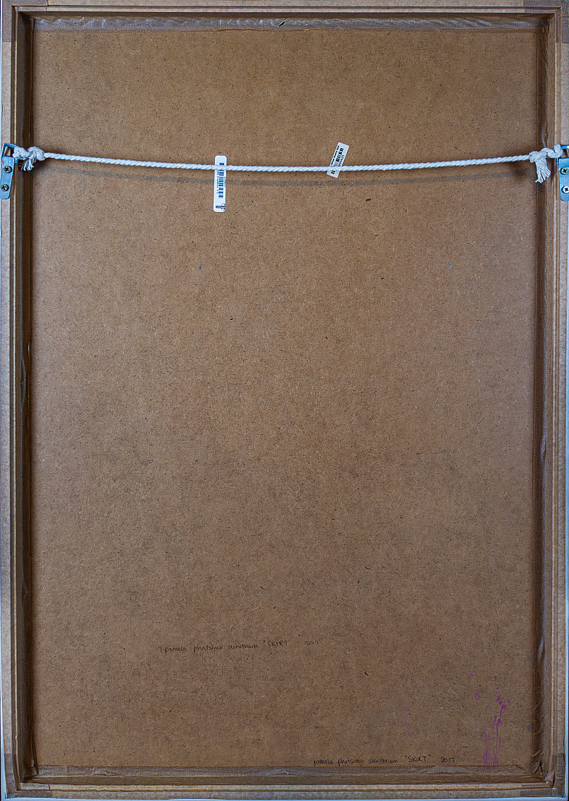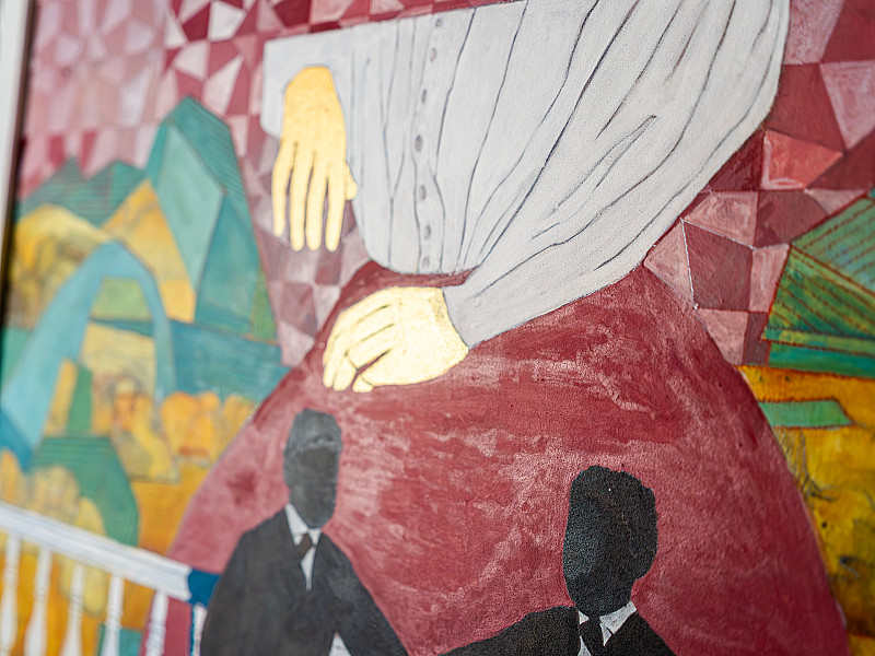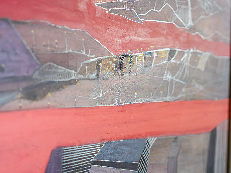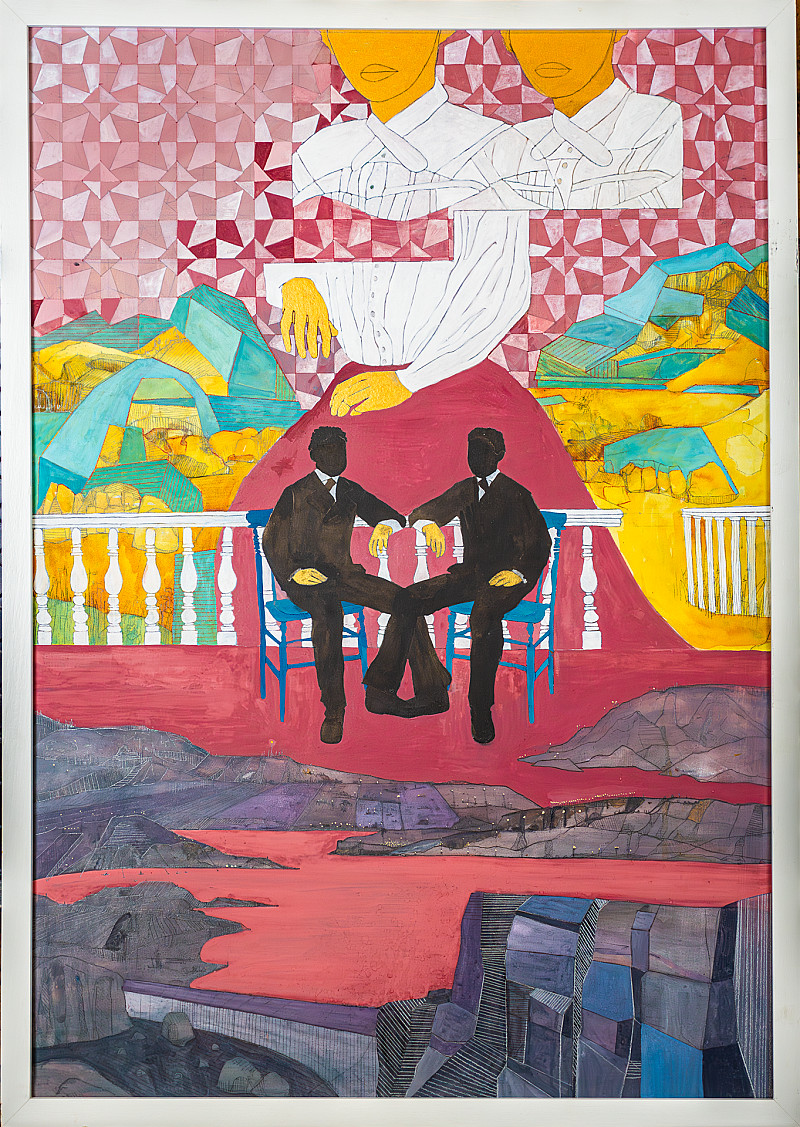 Dated 2017. predominantly maroon. Two figures in middle ground painted as sillouhettes. two white female sillouhettes at the top foreground. black mountains in foreground.