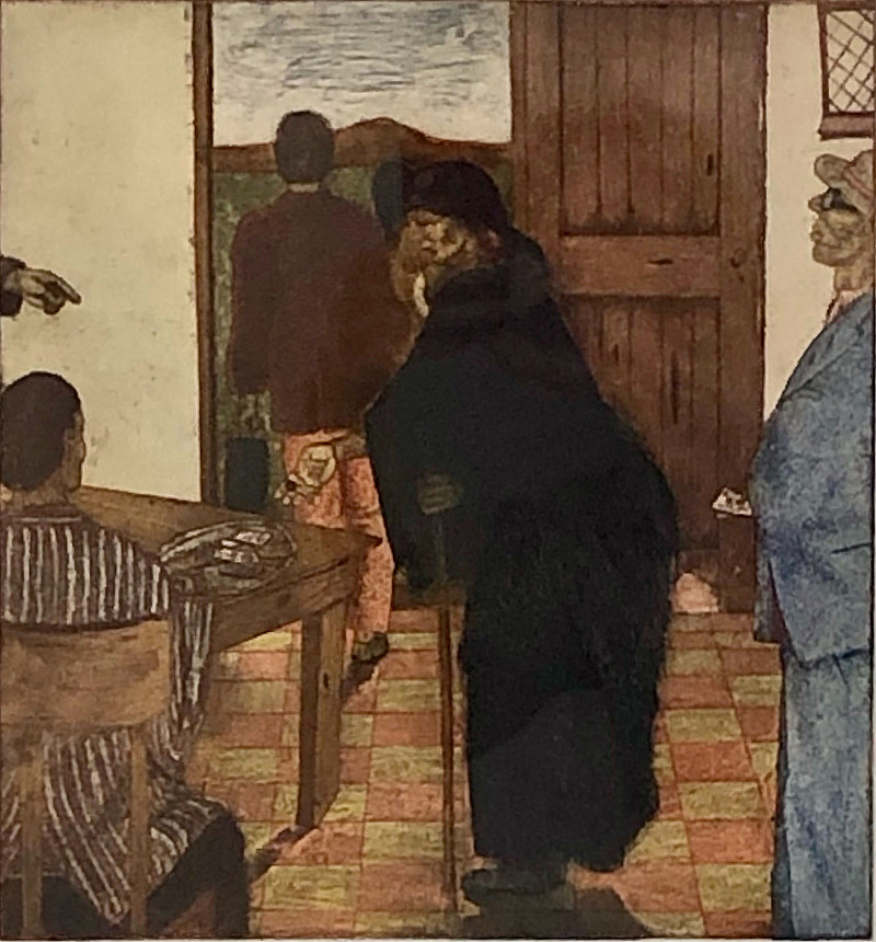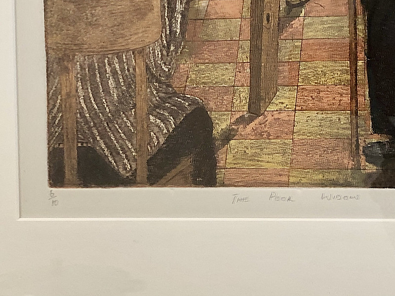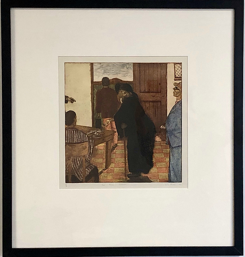 This artwork by Samkelo Bunu, titled The Poor Widow, depicts an interior scene that evokes themes of hardship and resilience. In the middle of the composition is a figure dressed in dark, heavy clothing, leaning on a cane, likely symbolising the widow mentioned in the title. Her hunched posture suggests age, frailty, or perhaps the weight of her struggles. She is surrounded by humble, everyday items—wooden furniture, folded fabrics, and a checkered floor pattern that adds depth and texture to the setting.