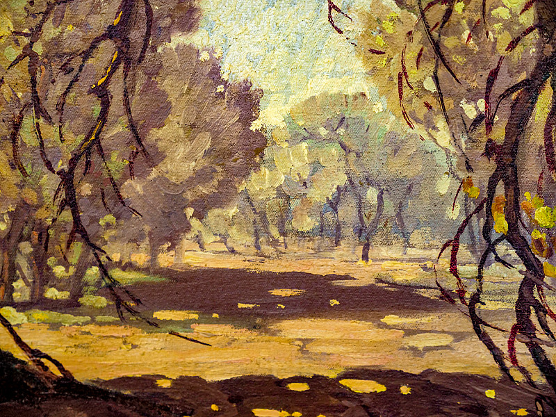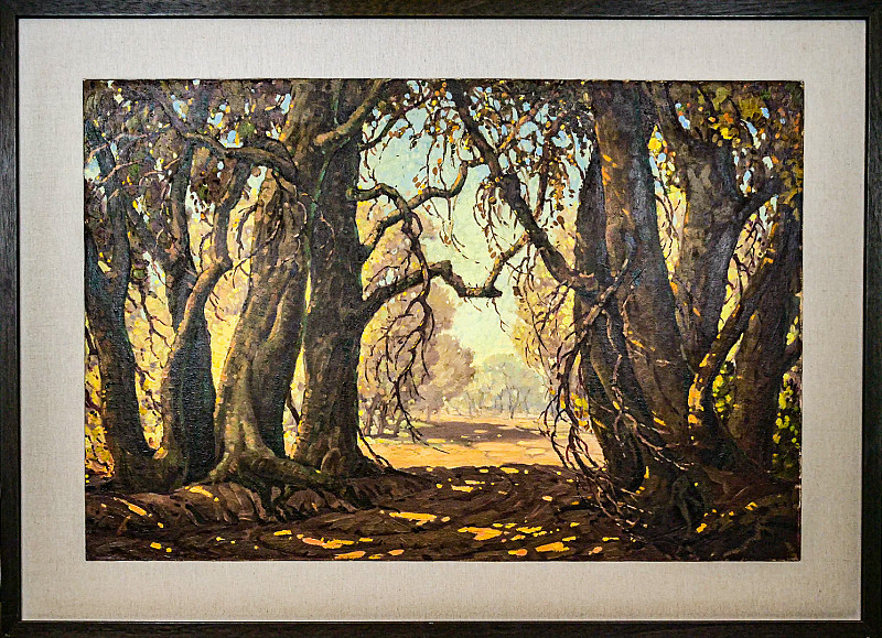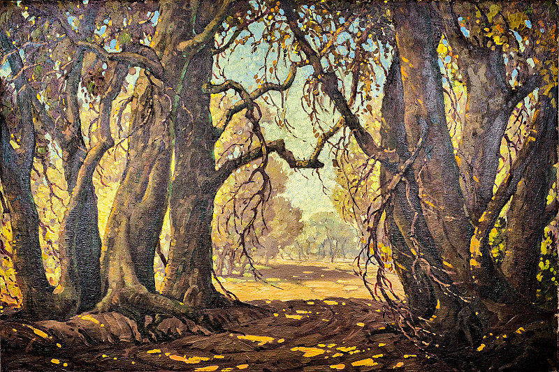 Forest with many tall brown trees showing just the bark and branches, patheay leading into open area with more smaller trees