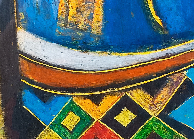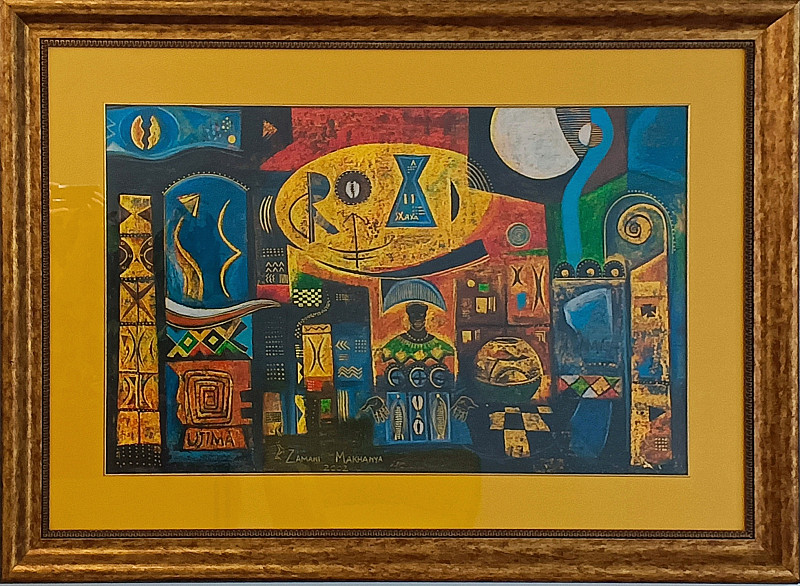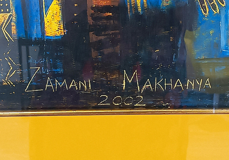 Zamani Makhanya’s Ujima exemplifies his mastery of the ‘sgraffito’ technique, which he developed over years using oil pastels to build rich, layered color surfaces. In Ujima, Makhanya etches into these vibrant planes, creating intricate variations in color and texture. His work poetically engages with Zulu cosmology, exploring African cultural themes such as spirituality, ancestry, and rituals. Through a personal symbolic language, Ujima invites reflection on life, death, and the mysteries of existence, all interpreted through Makhanya’s deep engagement with African aesthetics and philosophical inquiry.